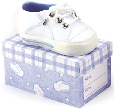 - Beautifully decorated blue ceramic sneaker that is a great addition to the nursery.